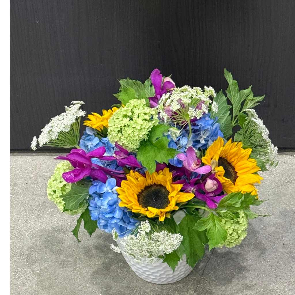 A gorgeous mix of bright orchids, sunflowers, and blue hydrangea. Cheerful to add color to any occassion.
