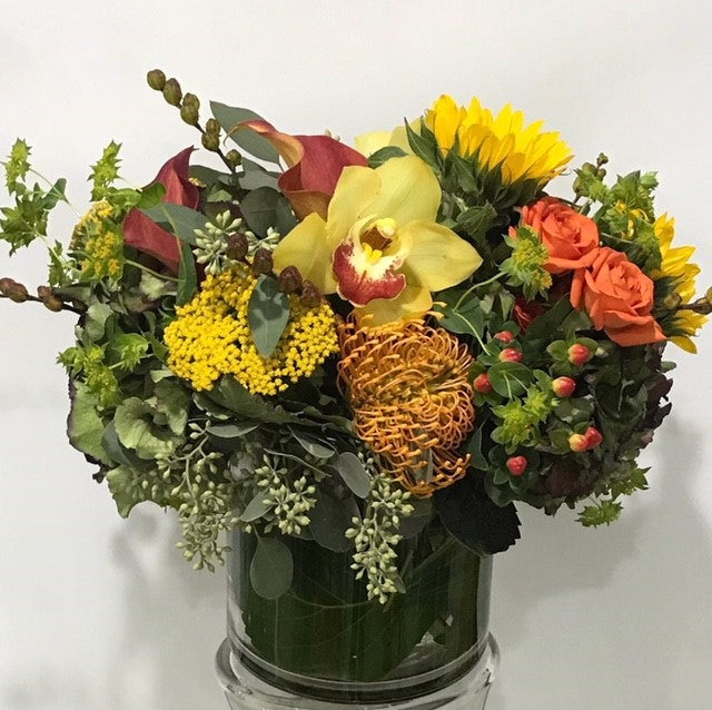 This arrangement will make you fall in love with Autumn. A combination of pincushion protea, cymbidium orchids, yarrow, sunflowers, calla lilies, and more will dazzle you with premium long-lasting blooms.