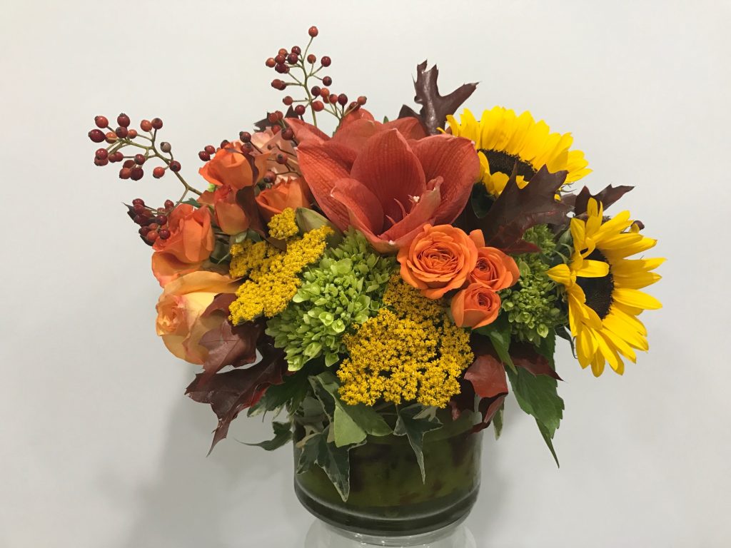 Send an arrangement that captures the season with amaryllis, sunflowers, roses, and seasonal berries.