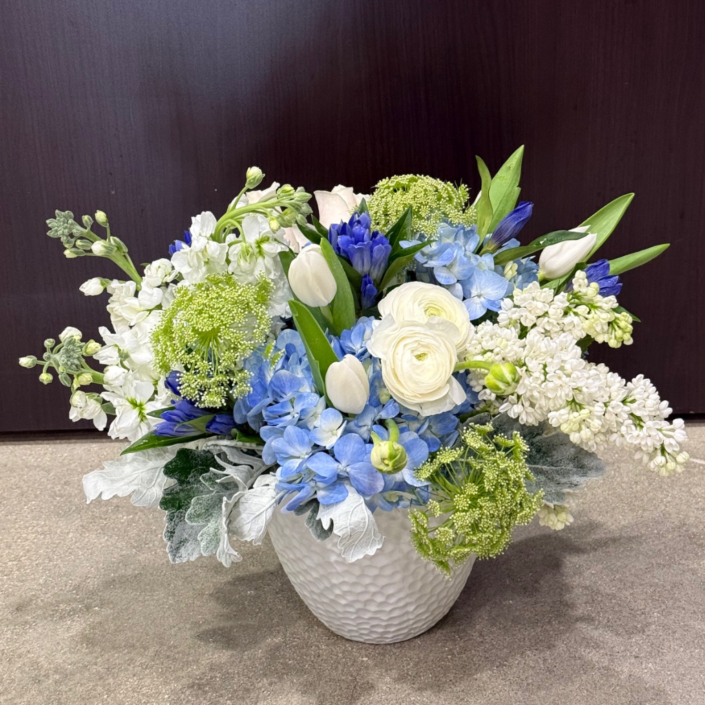 A premium arrangement of blues and whites to include ranunculus, hydrangea, Queen Anne's Lace, lilac, roses and more!