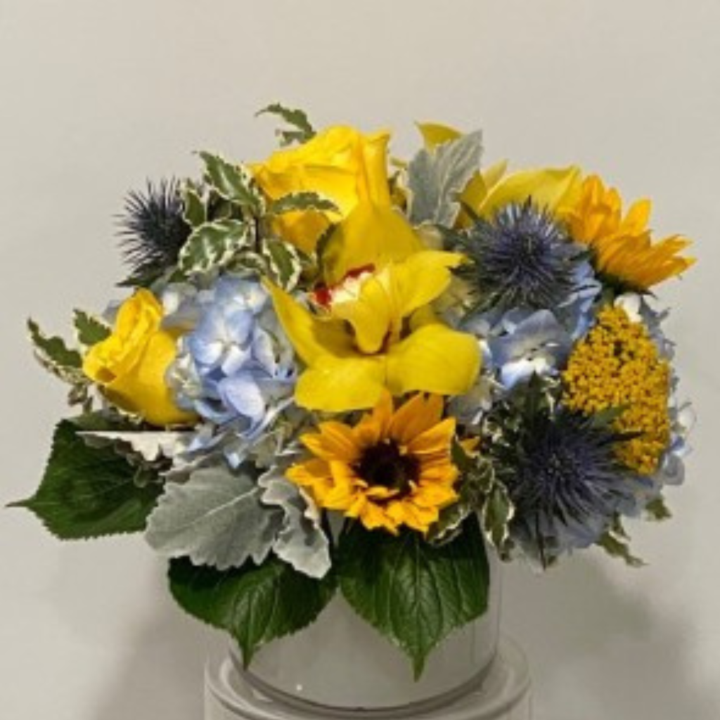 A bold combination of roses, blue hydrangea, sunflowers, thistle, and cymbidium blooms in a fun and exciting arrangement.