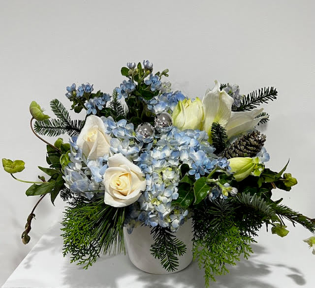 An arrangement of calming blues and whites with holiday mm balls and greenery.