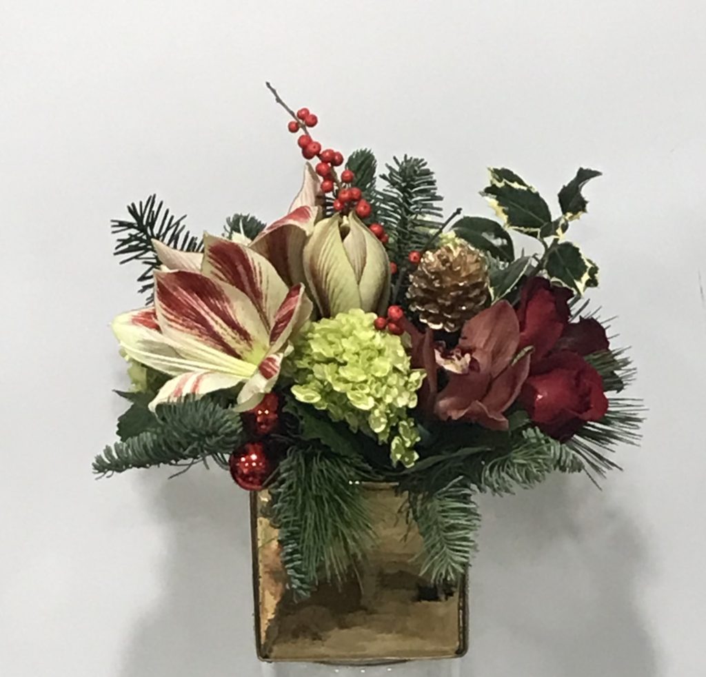 Our gold container arranged with candy cane amaryllis, red roses, mini green hydrangea, and holiday greenery.