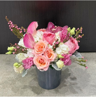 The prettiest combination of pastels with calla lilies, spray roses, lisianthus, hydrangea, and orchid blooms in our grey Cherie vase.