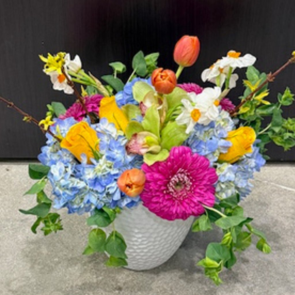 Our 6" dimple vase stuffed with hydrangea, roses, gerberas, tulips, and much more.