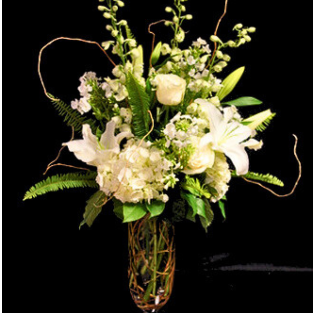 A tall and elegant display of hydrangea, roses, lilies, and seasonal complimentary flowers.