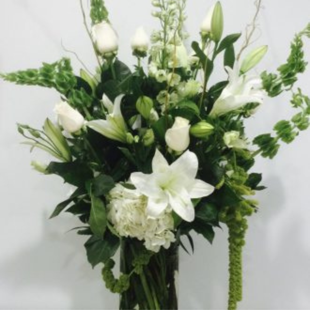Welcome to the garden! This arrangement adds life to any room with its Bells of Ireland, lilies, roses, and finishing touches of curly willow.