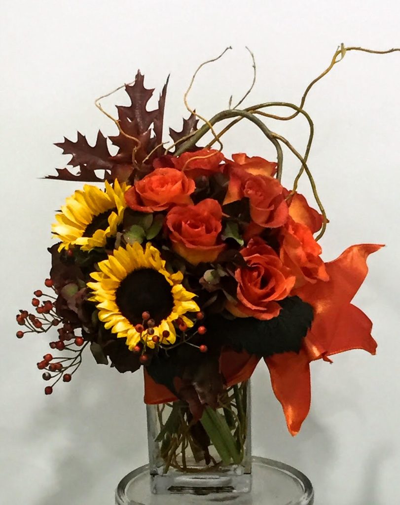 A combination of sunflowers and roses with curly willow and berries for a stunning fall look.