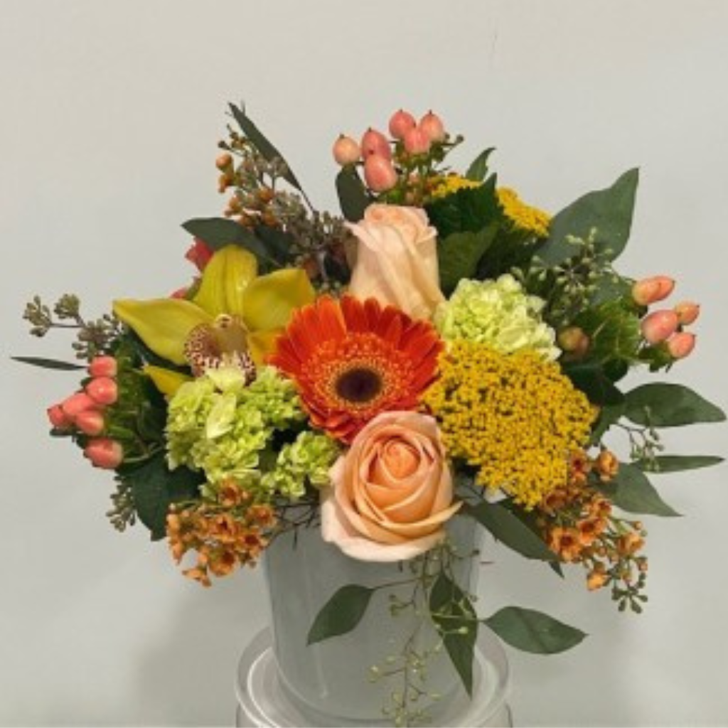 A colorful mix of fall flowers in a white ceramic vase. Oranges, yellows, and greens in a lovely seasonal display.