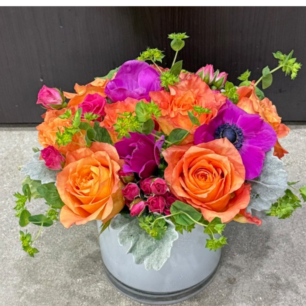 A spirited mix of oranges and purples featuring fee spirited roses.