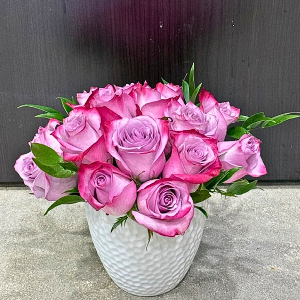 Lavender roses mounded in a pretty dimple vase with just a touch of greenery.