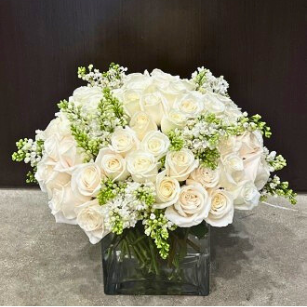 A deluxe arrangement with mounded white roses with stems of lilac all nestled in square glass container.