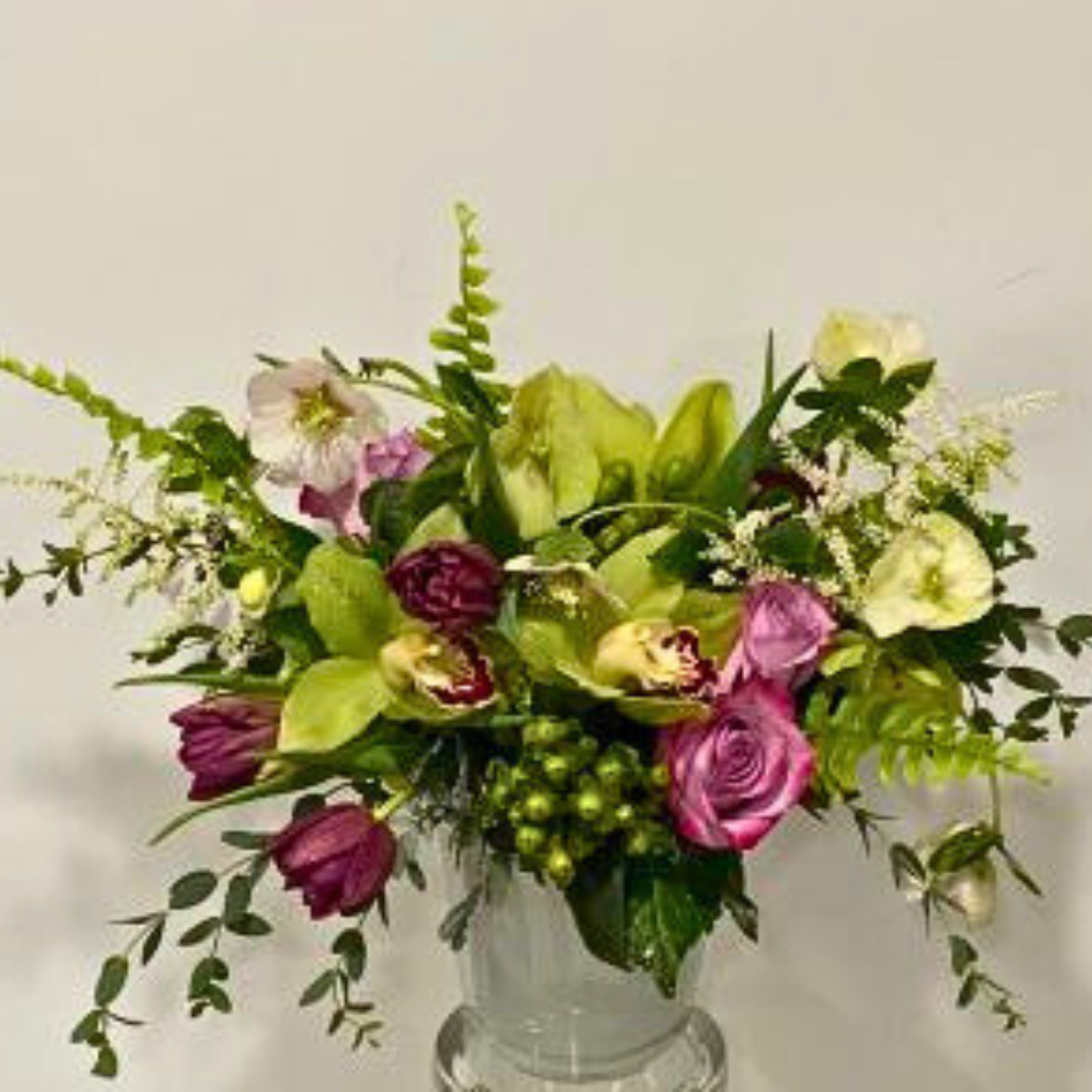 Cymbidium orchids, tulips, and roses are featured in this exciting modern arrangement.