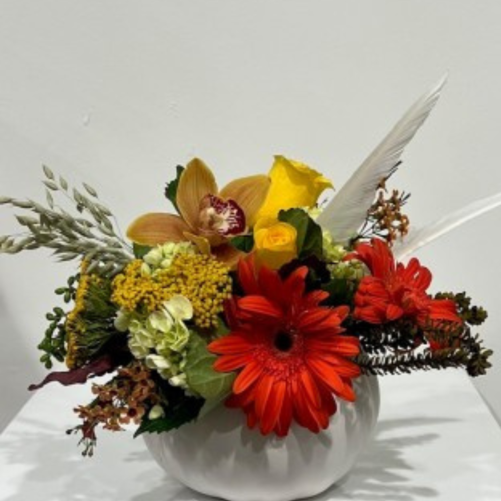 A lively mix of autumnal flowers arranged in our white ceramic pumpkin vase!