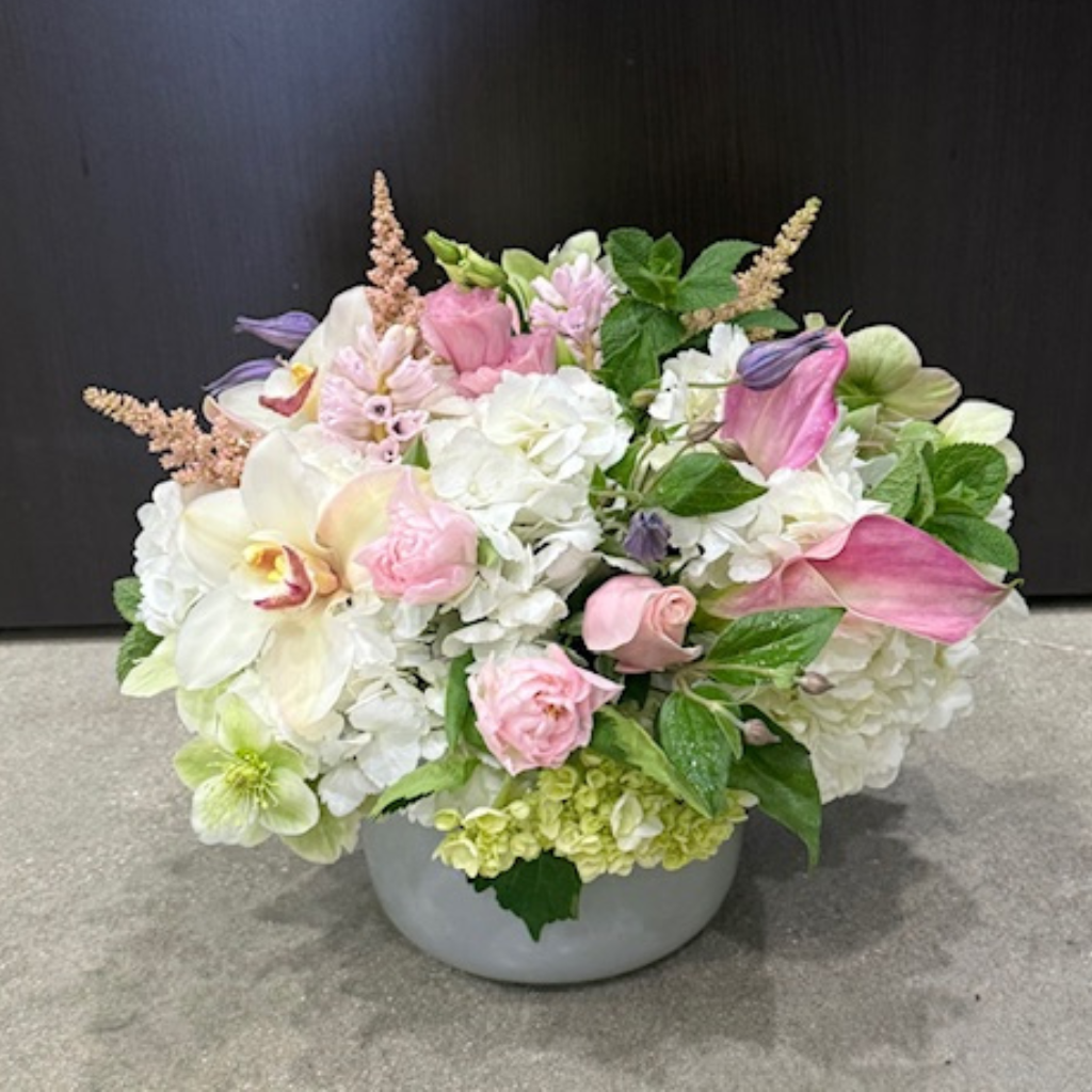 The perfect blend of pastels in a low and lush arrangement of hydrangea, astilbe, calla lilies, roses, hellebores, and much more.