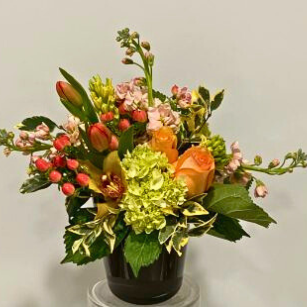Mixed shades of oranges and greens combined for a burst of fun in this mixed arrangement.