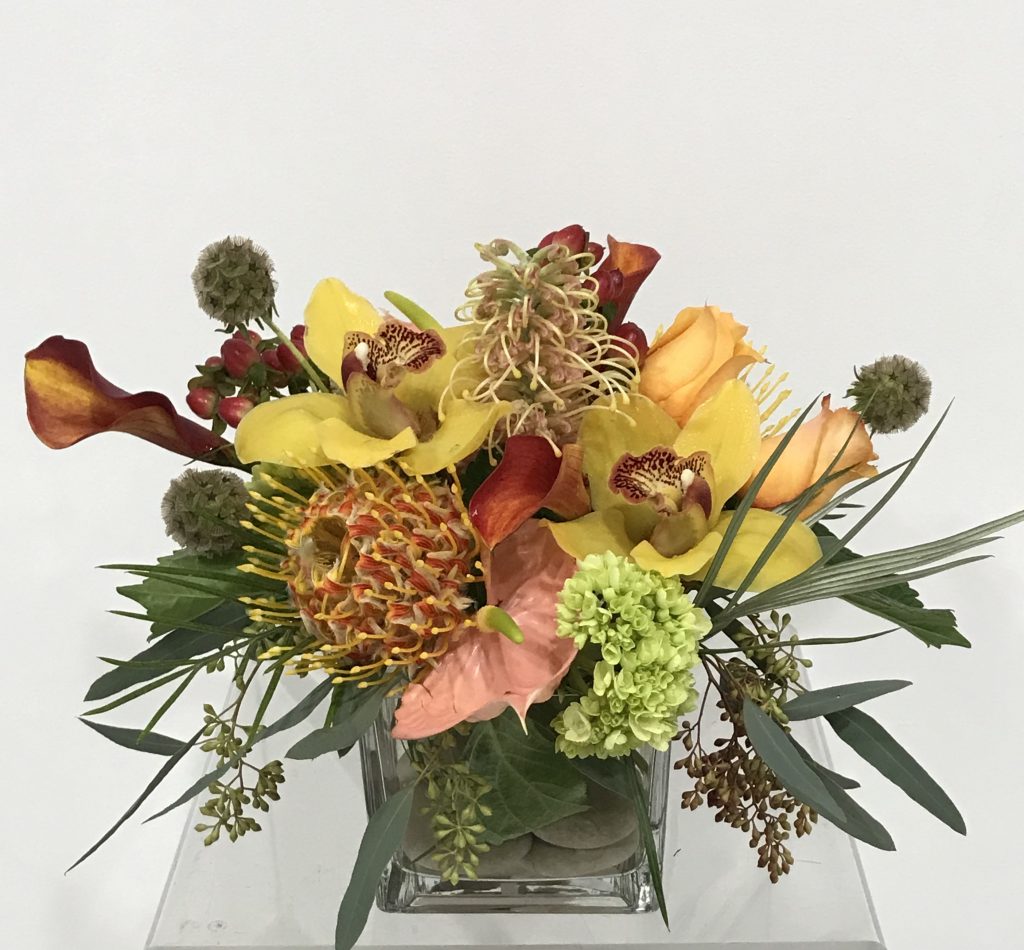 A cube full of colorful and exotic flowers. Lovely calla lilies, pincushion protea, and cymbidium blooms are highlighted in this fabulous mix.